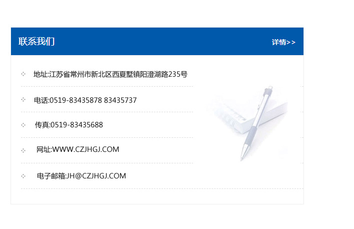 傳真:0519-83435688    郵編:213135    網址:WWW.czjhgj_com.bjsyyx.com    電子郵箱:JH@czjhgj_com.bjsyyx.com